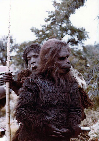 In the monkeys' next sequence, they are to be attacked by timber wolves. The Mountain Man, in full makeup, wants to be sure his part has not been enlarged to include him in the timber wolf sequence. He is NOT a stunt man!