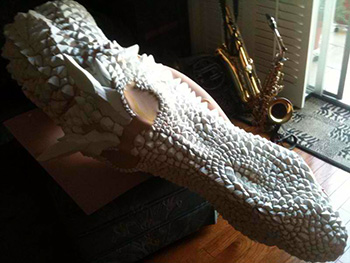 Now, with all the ridges attached, the dragon's skull is a thing of beauty, even without its final subtle colors and shadings -- but there's no room inside the house large enough for that.