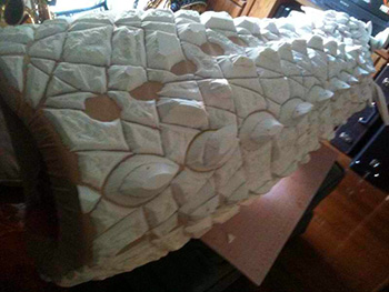 As the scale patterns were approved, BIlly glued them in place. Here, he's left the center ridge unfinished, because it was not yet clear just how tall the spines should be.