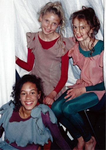 My Waifs-in-Waiting were costumed by Alice Hughes, had their makeup and hair done by Joanne Frye and were eagerly waiting for the call. Abandoned and forlorn, they managed to smile for our London still photographers Dennis and Steve Ramsey. From left to right (and down to up), the young ladies are Aimee Johnson, Yvonne Hill, and Rosy Meredith. No 'opening night jitters, here.' They'd been well-rehearsed in their lines, their actions, reactions, "business," unspoken lines and background stories at Saint Margaret's church in Coventry and were already 'in character.' Coach Marion Sands saw that they were thoroughly rehearsed on their gymnastic routines, but their first rehearsal in the theater was on the day before the premiere, and they discovered that despite the height and width of the marquee, they had to compress their performance area to allow for lighting and camera angles.