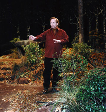 I blocked out the action with Anna and the girls on the set, so they were ready as they could be as the audience filed in, but when the Waifs and Queen of the Sidh exited, I had to perform the entire epic rhyme from memory, playing every role, and bringing each individuated character to life through changes in my voice and mannerisms. The fact that it rhymed helped keep me on track. And somewhere, out in the darkness beyond the stage, my daughter, Lisa, was following along in the script. She had discretion to stop the show if I dropped a quatrain or flubbed a line, for unless corrections were made on the spot, continuity would be lost. The lighting and camera crews had to guess which way I would turn next, for as I performed, I was inventing my "businees" and action on the fly, and no one knew where my next step would take me, not even me. |