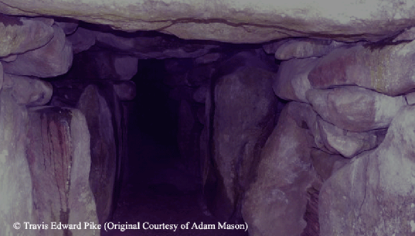 This photo of the entrance to the West Kennet Long Barrow was taken in 2009 by Adam Mason. It is much higher and wider than the one Morgen crawls into following a mastiff down into the Tomb of Every Hope. The stone slab corridor will continue to grow smaller as Morgen goes on, until he has to crawl along on his belly in the near total darkness, but he hears the dog in the distance, barking inside what sounds like a large chamber, so he keeps going. Suddenly, the floor of the stone slab corridor seems to fall away. In fact, Morgen has just emerged from the end of the passageway, and with the mastiff slobbering all over his face, he pushes his way out of narrow passageway and falls into the Tomb of Every Hope, a large vaulted chamber with a brook running through it, dimly lit by an oculus-like opening at the very top.
