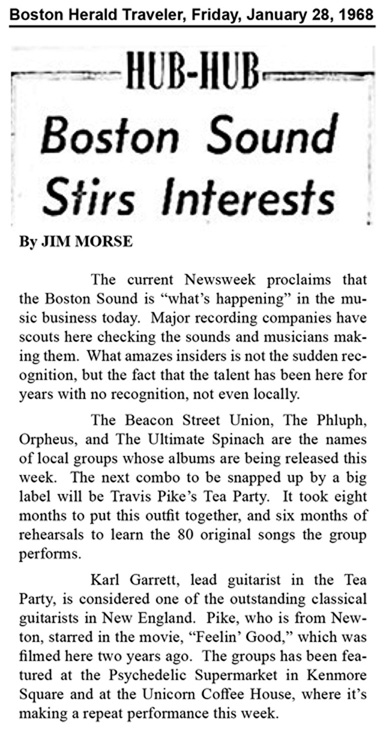 The Psychedelic Supermarket in Kenmore Square booked out of town acts by arrangement with their promoters, who sought exposure for their groups in the Boston area. Travis Pike's Tea Party was one of the local exceptions. They played the Supermarket on several occasions, primarily as an opening act for groups like Moby Grape, Spirit and The Fugs.