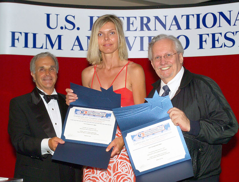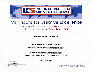3 JUNE 2006: Chairman Lee Gluckman of the U.S. INTERNATIONAL FILM & VIDEO FESTIVAL (left), presents Certificates of Creative Excellence to Producers Jo Christensen (center), and Travis Edward Pike (right), for their New Playwrights Foundation Production, VOLUNTEERS FOR VERDI. Those are not duplicate awards. The film won certificates in two separate competition categories - "Arts: Performing Arts," and "Documentary: 60:01- 90:00." |
